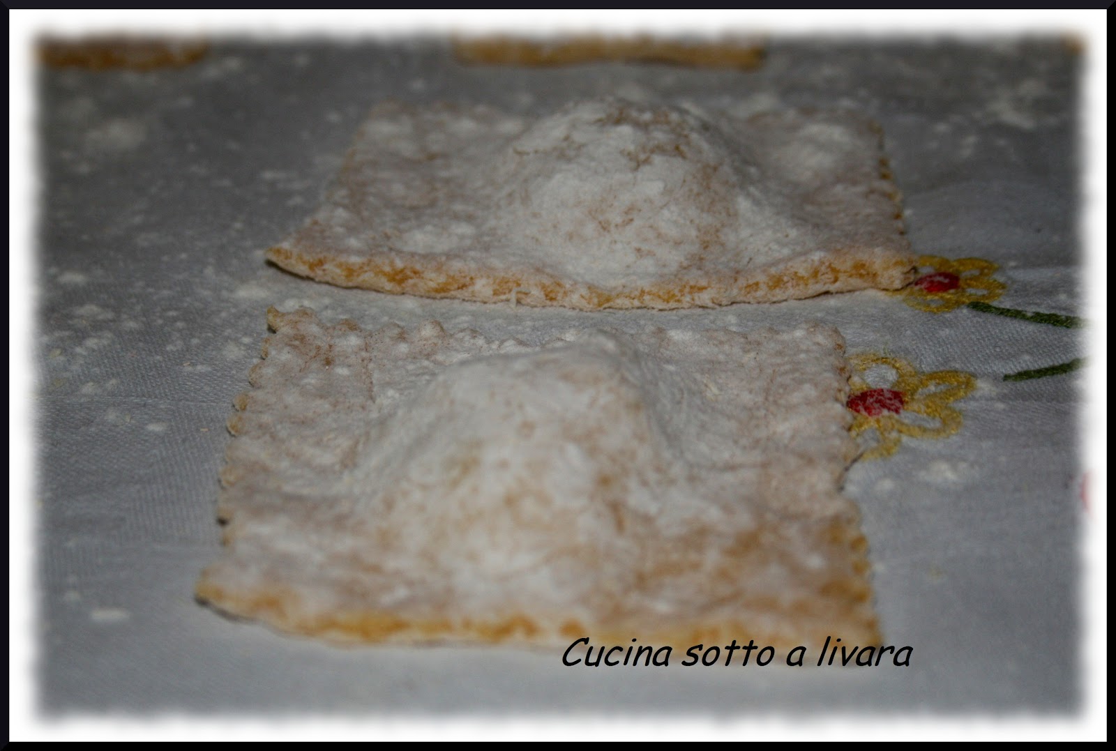 A questo punto cercate di sigillare bene i bordi e infarinate i ravioli che sistemerete in una tovaglia stesi per qualche ora .